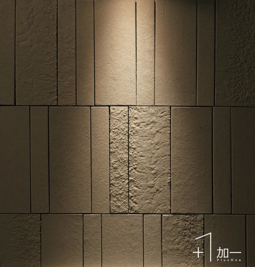厚重感十足的大尺寸磚面與小尺寸磚面搭配,形成表現力豐富的墻面。通過濕式磚特有的柔潤質感以及不同質感紋理的隨機變換,讓墻面表現出如古跡般的華麗。
