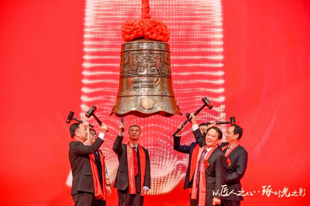 緊接著,由東鵬控股董事長何新明、清遠市委常委、常務副市長呂成蹊、佛山市副市長趙海、中國建筑衛生陶瓷協會會長繆斌、東鵬優秀經銷商代表伍鴻達、東鵬核心技術骨干代表姜安寧共同敲響開市寶鐘。